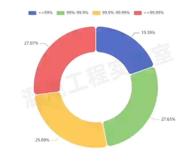 1)调查数据显示,近 20% 的受访用户所负责的产品可用性低于 2 个 9,近半数产品的可用性能低于 3 个 9。这意味着 47.04% 的用户每个月要忍受高于 44 分钟(可用性 99.9%),甚至超过 7.3 小时(可用性 99%)的服务故障。