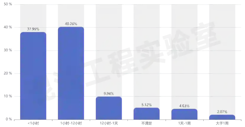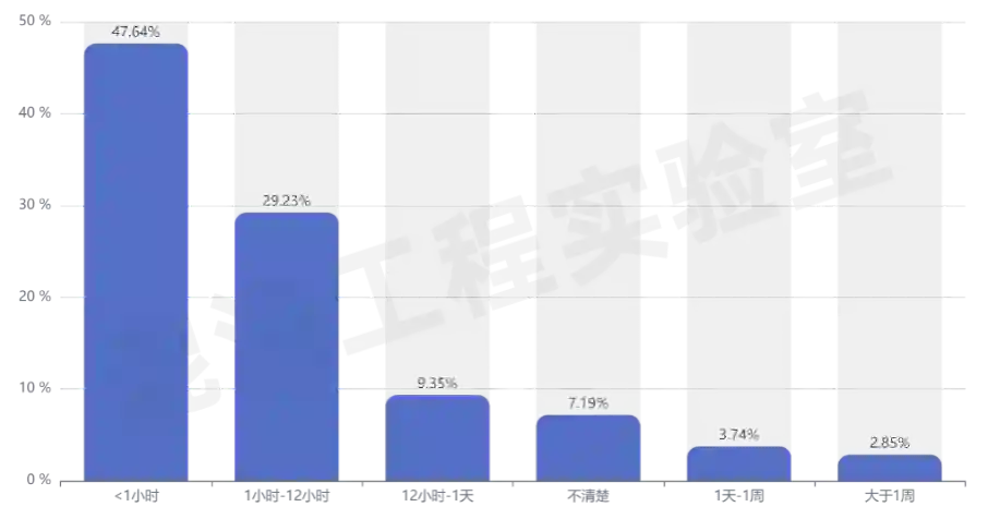 故障发生之后的解决情况也差强人意:仅不到一半的用户故障平均发现时长(MTTD)小于 1 小时;故障平均修复时长普遍超过 1 小时,超过 6 成故障修复时间(MTTR)高于 1 小时,甚至有约 20% 的服务故障修复时间超过 12 小时。