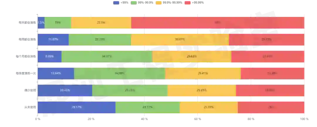 调查数据显示,近 20% 的受访用户所负责的产品可用性低于 2 个 9(意味着用户每个月要忍受超过 7.3 小时的服务故障),超过 4 成产品的可用性低于 3 个 9(意味着用户每个月要忍受超过 44 分钟的服务故障)。