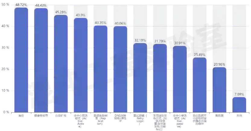 2)产品可用性的提升方式:备份、健康性检查、自动扩容、多中心双活模式、数据库复制集调查数据显示,48.72% 的用户会选择使用“备份”作为提升产品可用性的方法,48.43% 的用户会选择使用“健康性检查”,而自动扩容以 45.28% 的比例跻身产品可用性提升方法的第三位,多中心双活和数据库复制集分别以 43.9% 和 40.06% 的占比分列四、五位。相关人员可参考此数据以指导产品可用性提升建设规划。
