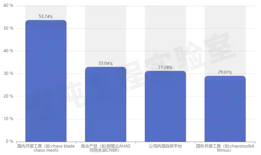近半数企业在研发、测试环境中使用混沌工程,仅不到 20% 的企业在生产环境中开展混沌工程演练,混沌工程在内部使用的技术复杂度不够高;