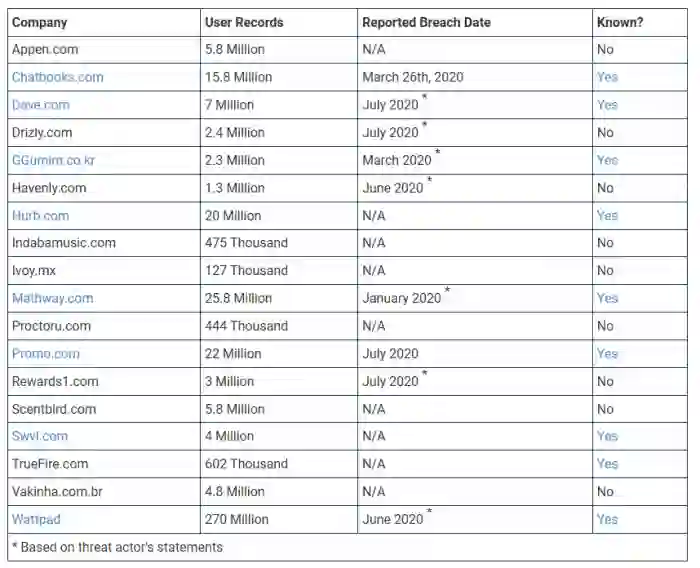 在 7 月 21 日以来发布的数据库中,其中 9 个数据库在过去已经以某种方式被披露,另外 9 个此前并未披露。18 起数据泄露事件的完整名单如下: