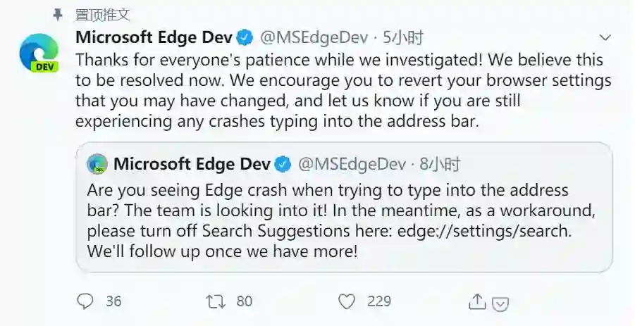 最新版 Edge 浏览器被曝存在软件 bug,只要用户在地址栏输入任意内容就会导致浏览器崩溃。更具体来说,用户只需要将焦点移到地址栏上,按下键盘上的任意按钮,浏览器就会崩溃。微软在推特上承认了这个问题,并解释说用户禁用搜索建议就能解决。随后微软积极采取相关补救措施,问题已经修复。