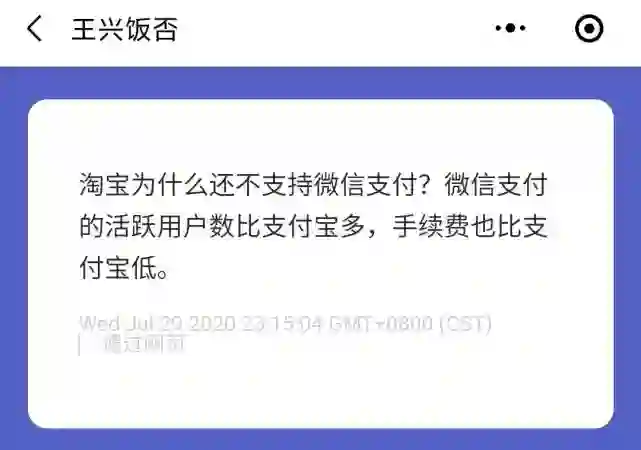 7 月 29 日晚 23 时许,美团创始人王兴在个人饭否上对此回应称:“淘宝为什么还不支持微信支付?微信支付的活跃用户数比支付宝多,手续费也比支付宝低。”