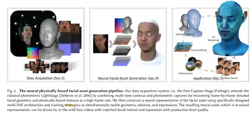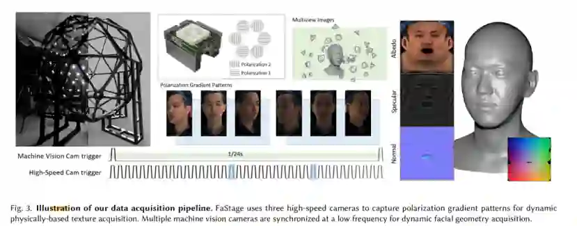 首先是训练数据采集。研究人员使用了穹顶光场设备采集演员的面部资产。模特按照研究人员的设计进行面部表演,由穹顶光场以 24fps 采集了模特表演的动态面部几何和材质贴图(漫反射、高光、法线贴图)。