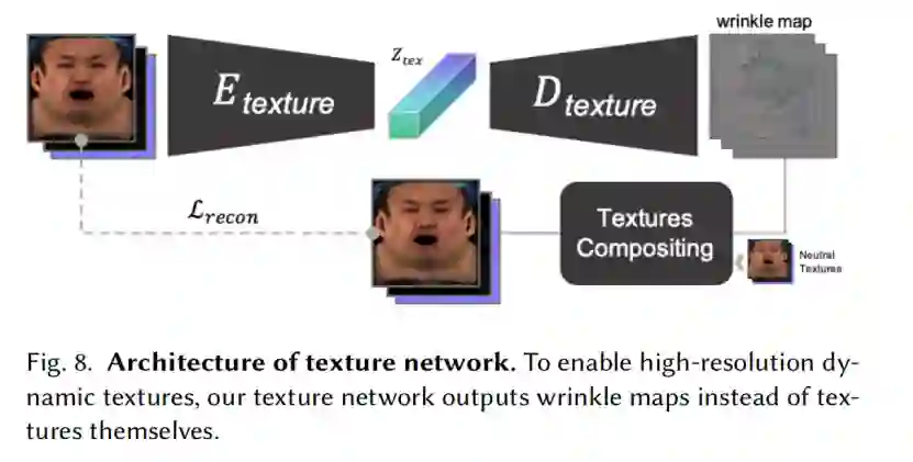 对于材质贴图训练,VAE 网络只需要能提取输入贴图中的表情隐向量,并根据其恢复出输入材质贴图即可。值得注意的是,这里使用了皱纹图的方式来表达材质贴图变化,具体来说,是网络输出当前帧材质贴图与无表情材质贴图的差值。将这张皱纹图线性放大到 4K 分辨率下并与无表情材质贴图叠加,就能得到高分辨率的面部材质贴图。这样既可以保留高分辨率贴图下的毛孔级面部细节,又可以精准表达皱纹、阴影等在动态表情中出现的面部特征。