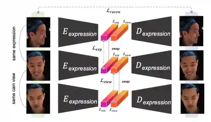 在训练表情网络时,他们使用了全新的三元训练法来监督训练。训练时,将某张图片与其相同视角不同表情的照片,以及不同视角相同表情的照片分在一组,使得网络能够学会从输入视频帧中解耦表情与视角信息,从而在视角变换的情况下也能稳定地以隐向量形式提取出表情信息。