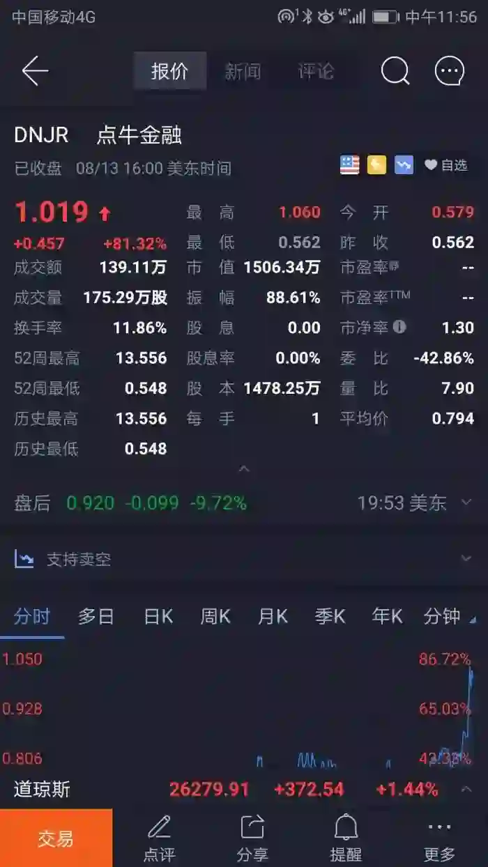 受美股大涨影响,美东时间8月13日,点牛金融股价随之大涨,重回1美元以上,收盘价1.019美元。