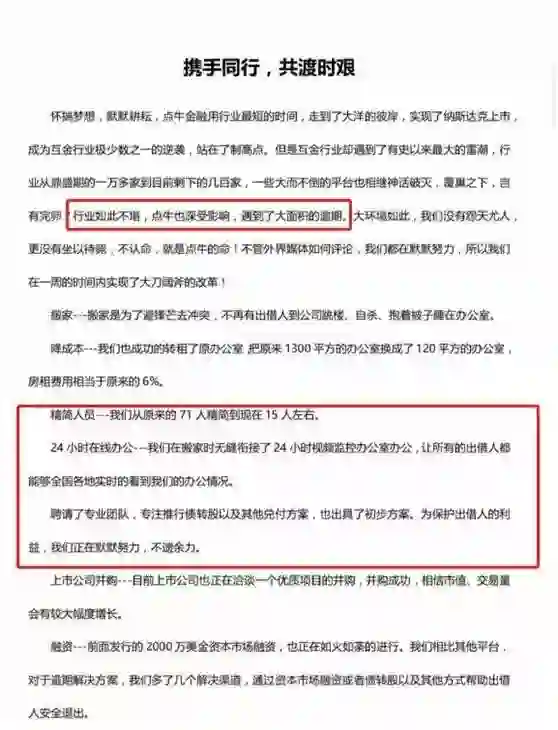 7月30日,点牛金融方面给出借人发来一份《携手共进,共渡时艰》的文件,坦言点牛金融受大环境影响,遇到了大面积的逾期,并表示已经搬家、降成本、精简人员(从71人降到15人左右)、24小时在线办公,且聘请了专业团队推行债转股以及其他兑付方案,正在进行2000万美元融资等。