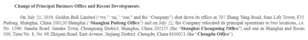 直到8月13日,点牛金融才发布公告称,公司已于7月21日关闭了位于上海浦东张杨路的办公室,公司新办公地点分为两处,分别为上海崇明区建设镇建设路、成都市锦江区东大街。