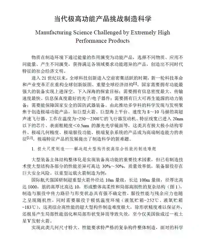 社会发展对产品的新需求不断挑战制造科学,人类破解科学难题、创造新产品满足社会变革的需求,世界文明发展的历次技术革命反复演绎着这条规律。当代的知识大爆炸和人类创新意识的大觉醒使社会对产品的需求更具科学幻想性、绿色现实性、产品功能与制造实现的极端性,也驱动制造科学在解决这类新难题的过程中创造着新产品,如超级功能深空探测器、超高速飞行器、超大型海上平台、超精密微纳芯片、超高能量激光武器等,这些产品的创造既传承了传统制造科学,又在难题破解中形成制造新原理,引发了制造科学的世纪变革。