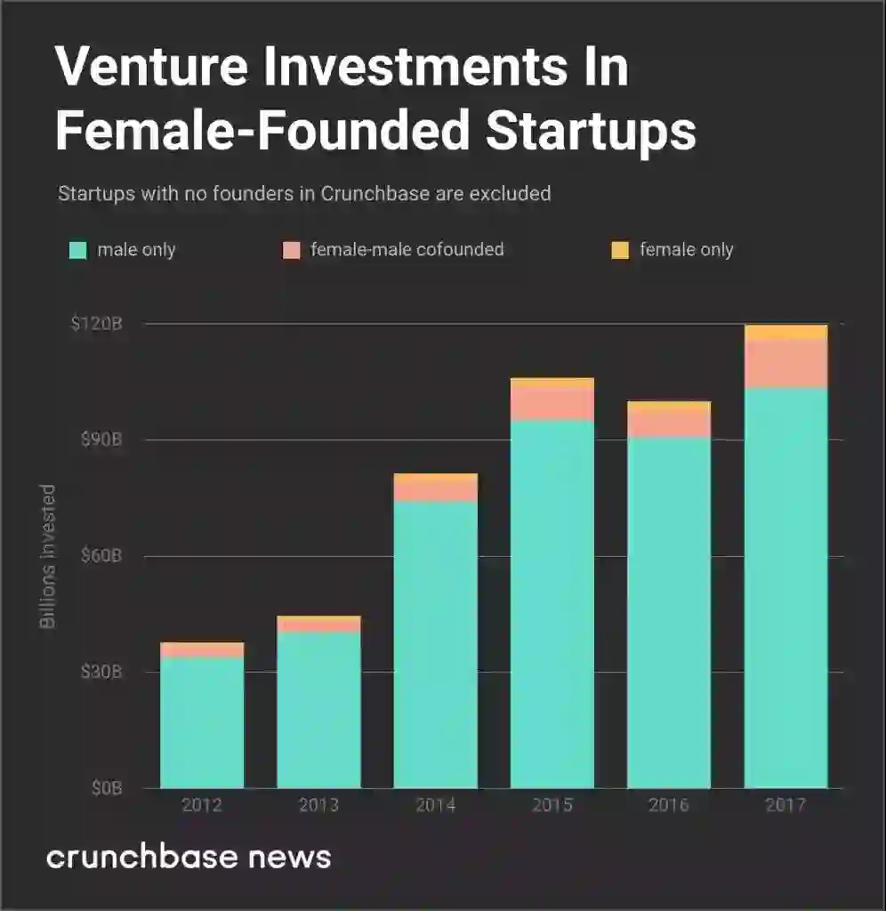 2017年,硅谷只有2.2%的风险资金用于全女性团队,12%的资金用于有男性和女性创始人的公司。相比之下,所有男性团队占总风投资金的79%,约670亿美元。