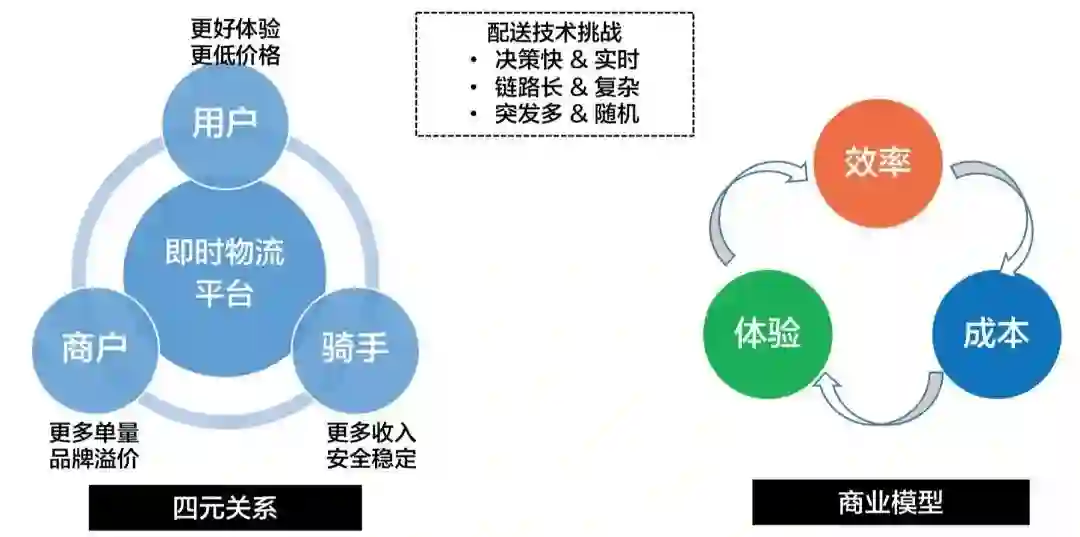即时配送,是一种配送时长1小时以内,平均配送时长约30分钟的快速配送业务。如此快速的配送时效,将传统的线上电商交易与线下物流配送(传统划分比较明确的两条业务)整合为统一整体,形成了用户、商户、骑手和平台互相交错的四元关系。