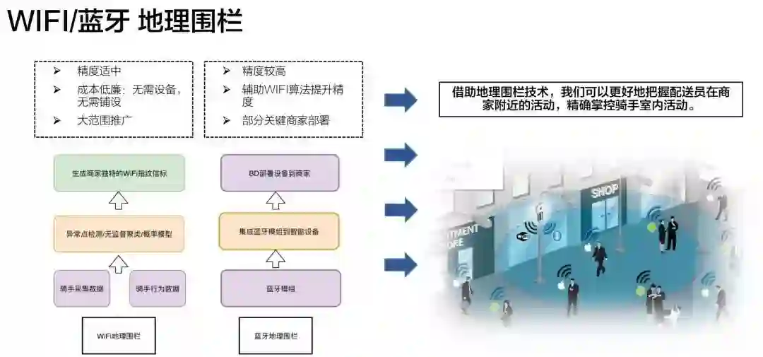 在ETA预估中已经展示过一些,不过之前主要还是基于骑手上报数据,这显然无法做到很高精确,必须引入更客观的数据进行描述。目前,我们选择的是WiFi和蓝牙的地理围栏技术作为主要辅助。