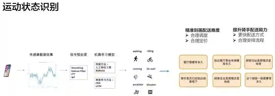 骑手在配送过程中经常会切换方式,比如可能某个小区不让骑电动车,那骑手必须步行,再比如骑手在商家发生长时间驻留,那应该是发生了等餐的情况(用户侧同理)。目前,我们选择使用基于传感器的运动状态识别作为主要辅助。