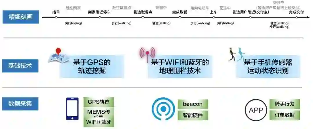 这些数据,大部分来至于手机,但是随着各种智能硬件的普及,比如蓝牙设备,智能电动车、智能头盔等设备的普及,我们可以收集到更多数据的数据。WiFi/蓝牙技术,以及运动状态识别的技术比较成熟,这里主要说一下概况,本文不做深入的探讨。