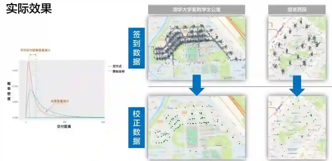 上图右侧部分看到,我们挖掘的交付点基本上能与楼宇的单元门对应。而且没有明显偏差比较大的部分。这个质量基本达到我们之前设定目标,也证明配送大数据的巨大潜力。