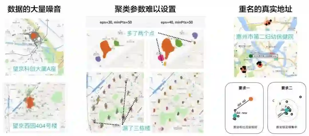 在数据挖掘实际过程中,其实并没有什么“高大上”的必杀技,无法使用流行的End2End方法,基本上还是需要对各个环节进行拆解,扎扎实实的做好各种基础工作,基本整个挖掘过程,分为以下几个步骤:(1)基于地址分组;(2)数据去噪;(3)数据聚合;(4)置信度打分。其中主要技术挑战,主要在各种场景中保证数据挖掘质量和覆盖率,具体来说主要有三个挑战: