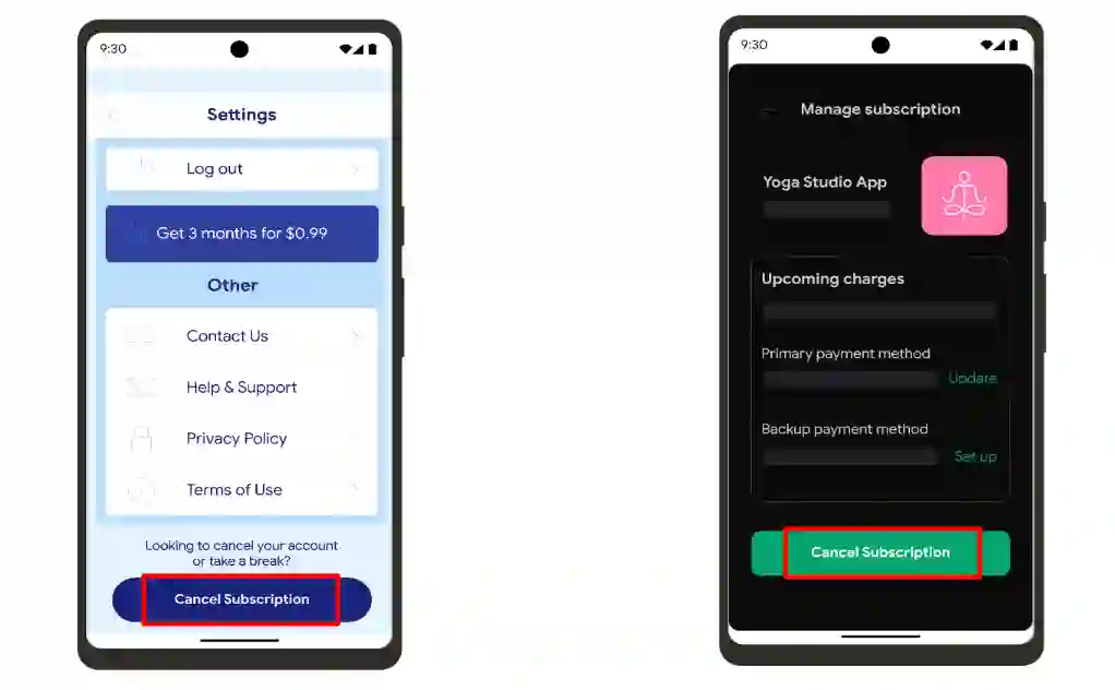 △ 取消订阅示例。左侧的 "个人资料" 部分提供了应用内取消订阅选项;右侧在 Google Play 的 "付款和订阅" 中心提供了取消选项
