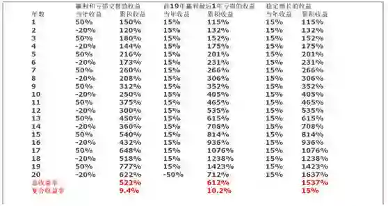 这个复利表,当我在十多年前年轻时做投资的时候,也是支撑我做投资的一个基础,因为虽然这个收益率不是很高,但我们只要坚持下去,这个财富的积累程度是非常可怕的。但是对这个复利的认识,如果仅仅是停留在一个稳定增长、每年增长多少,然后十年二十年增长多少,如果仅仅是停留在这个程度,那么对复利的认识是不完整的。这里我特别要强调对我们复利增长的一些有负面因素:可以看到在这张表格的中间这一栏,每年都是15%的增长,到第二十年的时候,如果这个增长突然中断,假设这个年度的收益率回撤50%,在投资这二十年的过程当中,你如果有一年表现比较差,那么这二十年积累的总体收益相差是非常大的。你只要犯一次严重的错误,那么二十年下来你的财富可能会缩水三分之二左右。也就是说在我们投资的一个历史当中,一次较大的亏损对我们财富积累的影响是非常大的。