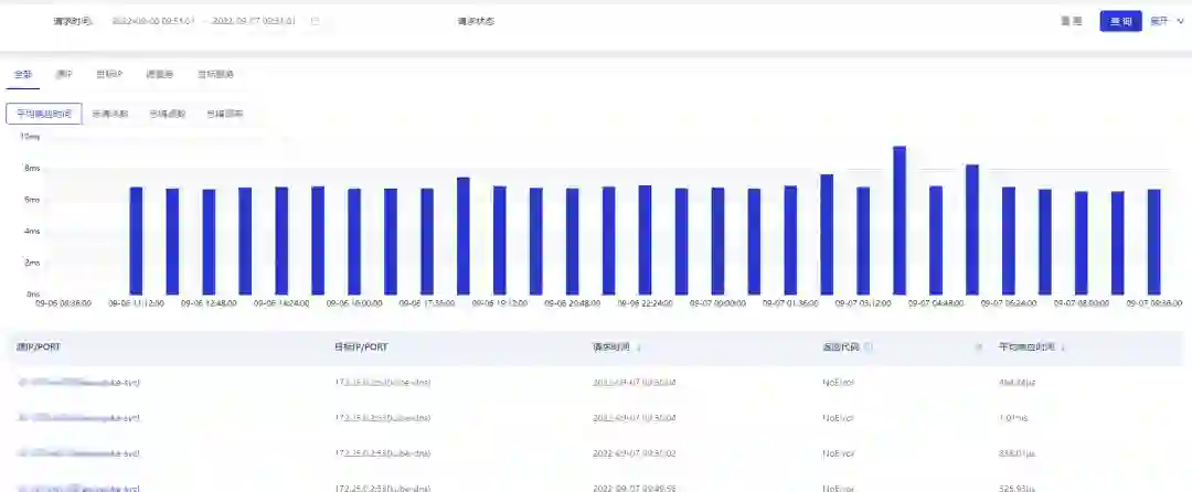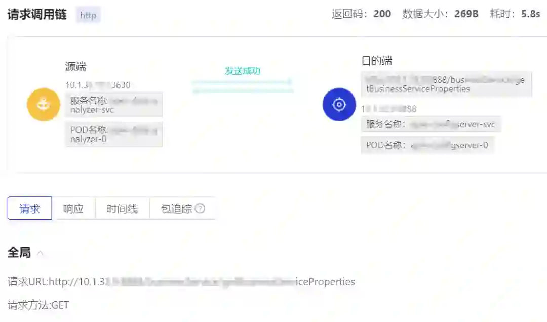 区别于传统的分布式追踪,基于 eBPF 的链路追踪不止能跟踪某次调用,还具有无入侵、语言框架无关的特性,请求如果包含了分布式追踪 TraceID,也能自动识别,方便联动分布式监控平台进行排查。对某次请求来说,可以精确看到接收、处理、回应、耗时的数据,方便问题排查人员从问题节点定位到问题接口,从而进一步辅助问题的解决。(如图 8 所示)。