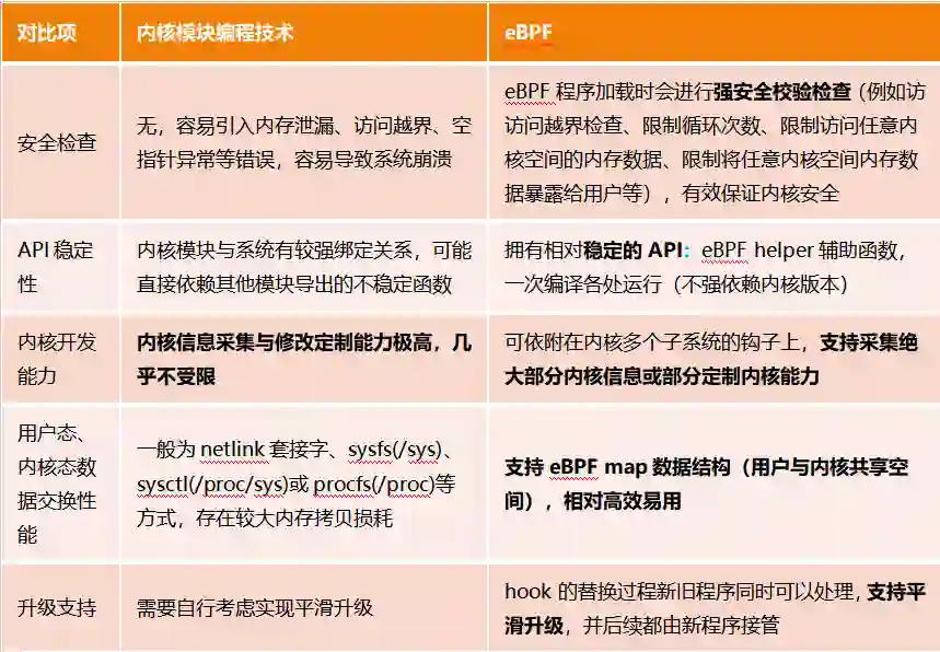 内核模块编程技术和 eBPF 技术的详细对比(如表 1 所示)