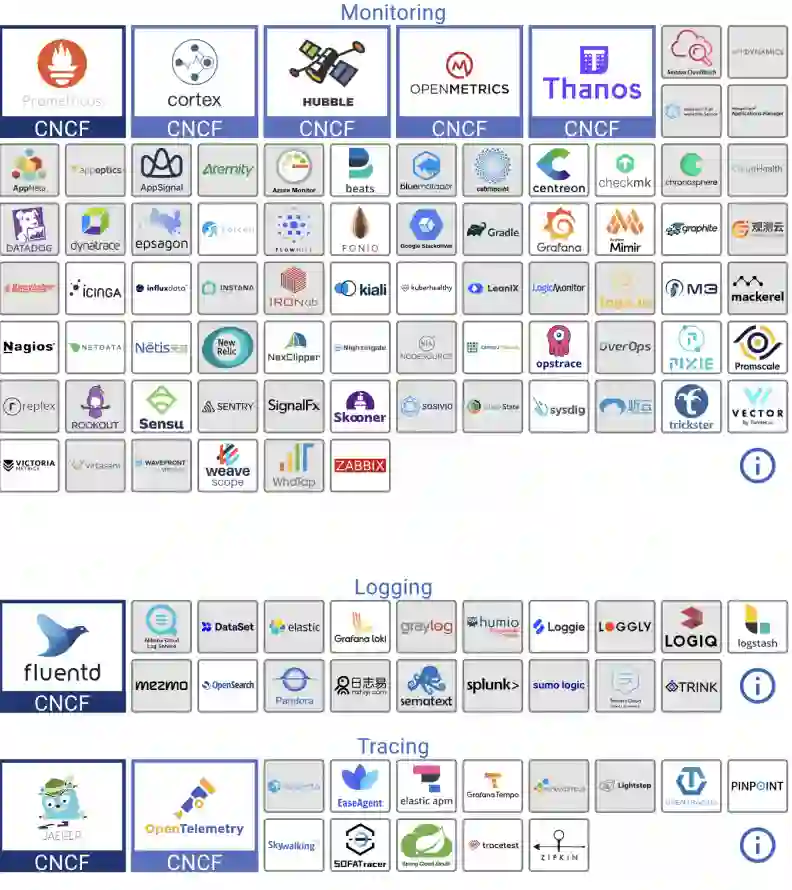 云原生基金会的项目全景图(CNCF Landscape)根据项目特点与价值,将提供可观测性能力的项目分为了监控(Monitoring)、追踪(Tracing)、日志(Logging)三类(如图 2 所示)。