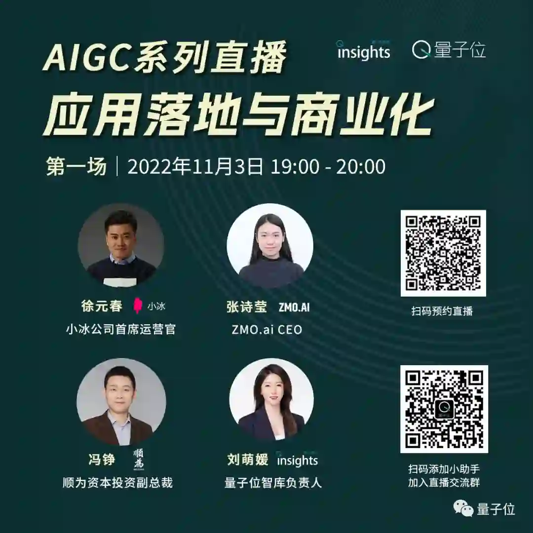 11月3-4日晚19:00-20:00,量子位智库邀请了国内AIGC的代表企业及深耕AIGC的头部一二级投资机构,我们将通过两场专业的线上panel,为大家深入解读AIGC的应用落地与商业化之路。