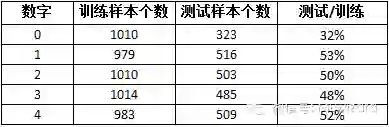 训练样本包括0,1,2,3,4五个数字及其像素矩阵。每个数字对应训练样本与测试样本数量如下表: