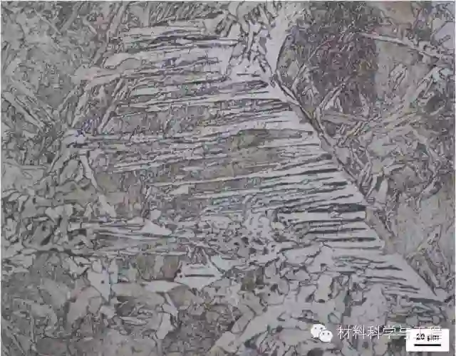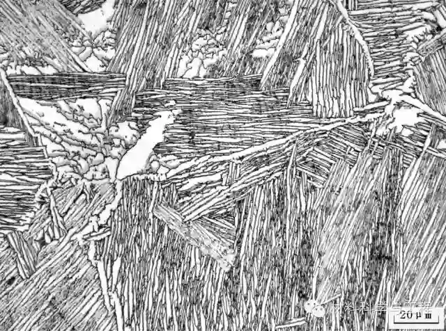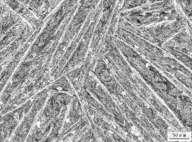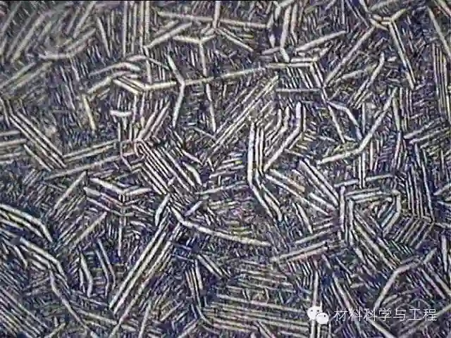 【71李金梅】低合金钢经4%硝酸酒精溶液侵蚀后,针状先共析铁素体沿原奥氏体晶界析出,向内部生长,平行排列。就像大海平面风浪乍起时景象。