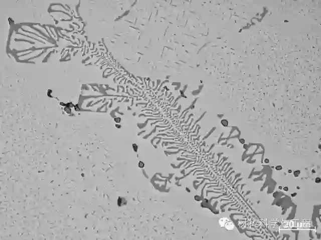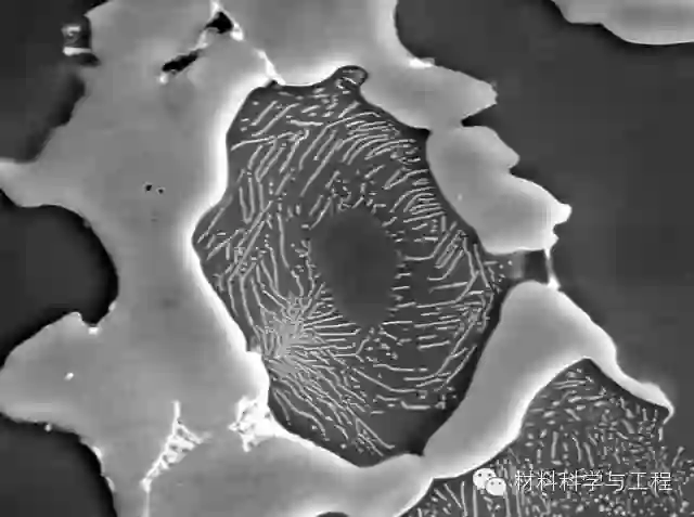 【80孙晶】Mg-8%Al-2%Ga镁合金铸态组织。仪器:JXJ-100型金相显微镜。作品描述:Mg-8%Al-2%Ga镁合金铸态组织 黑色为α-Mg(Al)基体,灰色大块状为β-Mg17Al12,灰色片状为凝固后由α-Mg(Al)析出的次生β-Mg17Al12。