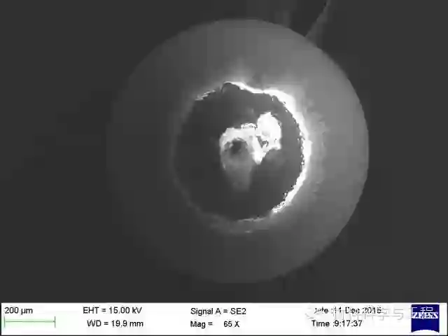 【65余成龙】荷电黑洞。对陶瓷密封小球蒸镀碳膜处理,并利用扫描电镜进行观察:由于电子束辐照导致荷电效应,在球面顶端出现类似黑洞的现象。