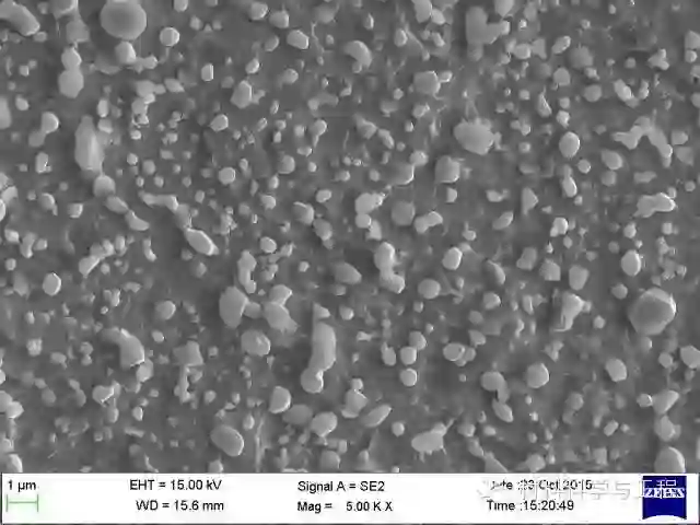 【72张宝燕】材料介绍:H13(4Cr5MoSiV1)模具钢。仪器:Zeiss Suppra55型场发射扫描电子显微镜。作品描述:H13钢球化退火保温一段时间直接淬火得到基体马氏体+球状碳化物。