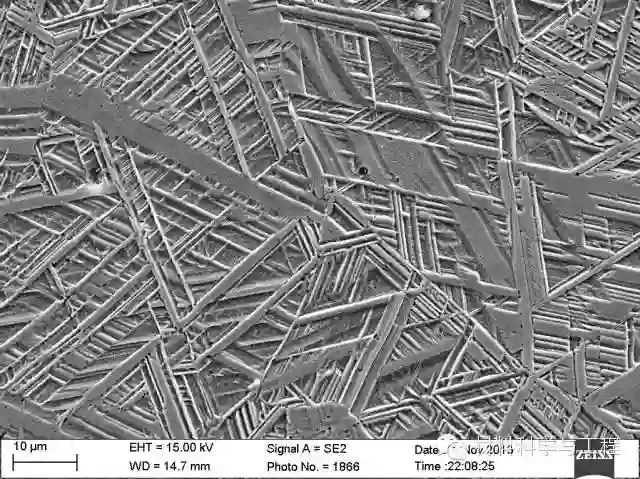 【74张宝燕】材料介绍:Fe-Mn合金。仪器:Zeiss Suppra55型场发射扫描电子显微镜。作品描述:Fe-Mn阻尼合金在一定的诱发变形下形成的马氏体。