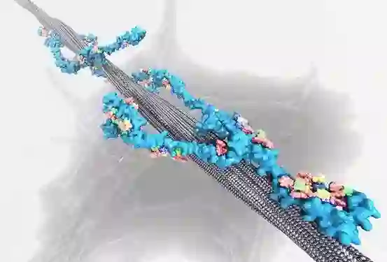 多价聚合物 - 肽缀合物(mPPC,青色中的聚合物主链和多色中的活性肽)围绕周期性β-淀粉样蛋白原纤维的分子模型。 mPPC抑制β-淀粉样蛋白原纤维的形成,其在阿尔茨海默病的发展中起基础作用。背景中的透射电子显微镜图像说明了体外原纤维聚集。