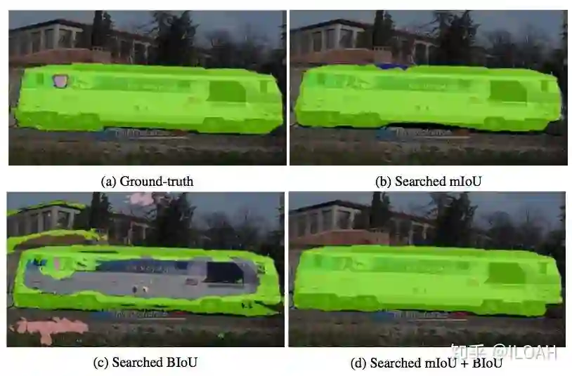 对于边缘相关的指标,我们发现,单独使用边缘指标指导训练会使模型只关注边缘的分割结果。图2展示了这个现象。通过将边缘指标和整体指标(如mIoU)组合进行训练,模型可以在保证合理的整体表现的同时提高边缘的分割效果。另外一个有趣的发现是,用来评估边缘准确度的Boundary F1 score在容许误差不为0时,用来指导训练可能会造成边缘的锯齿效果,这实际上是对这个指标的一个hack。我们在附录里讨论了这个问题。