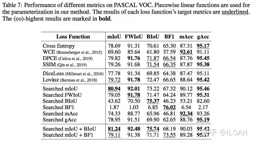 我们搜索出的代理损失函数可以很好地迁移到其他的模型架构和数据集,因此只需要一次搜索就可多次使用(不仅如此,我们发现针对mIoU搜索出的参数同样适用于FWIoU和Boundary IoU等同类指标)。下面的两个表是我们尝试的两种参数化形式的实验结果。