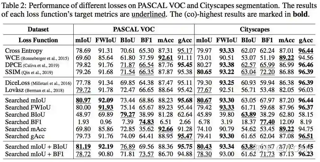我们在PASCAL VOC和Cityscapes上进行了实验。相对于手动设计的代理损失函数或Cross Entropy的改进,搜索出来的代理损失函数在主流的语义分割指标上都能达到on par或更高的水平,尤其对边缘相关指标的提升比较大。值得一提的有两点: