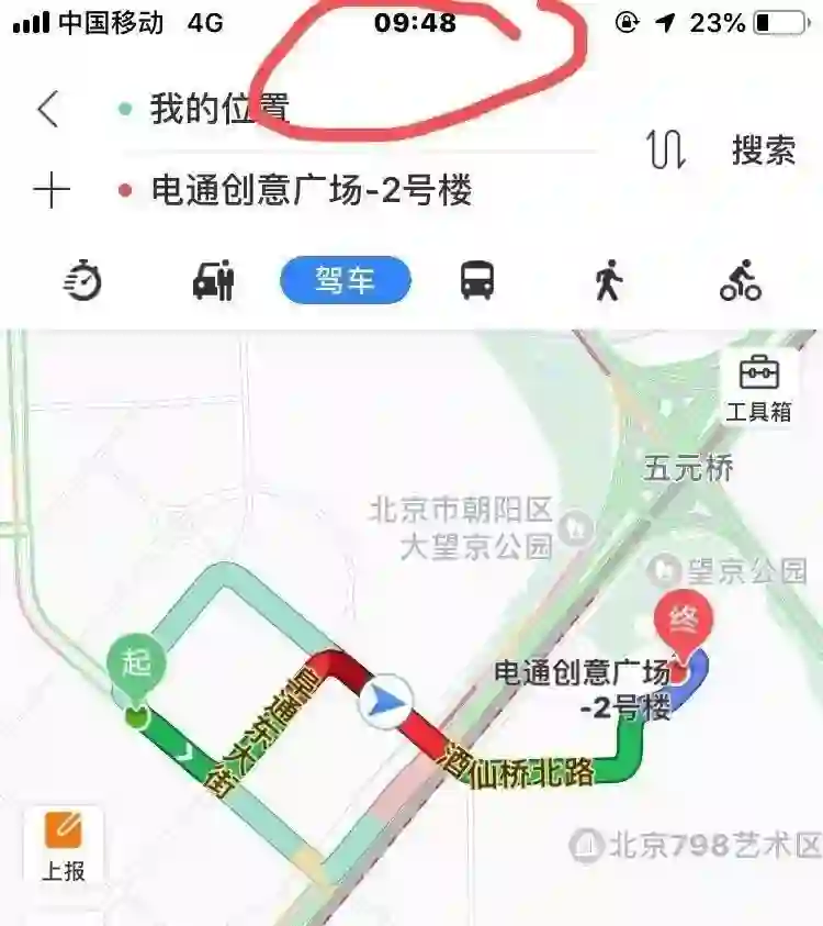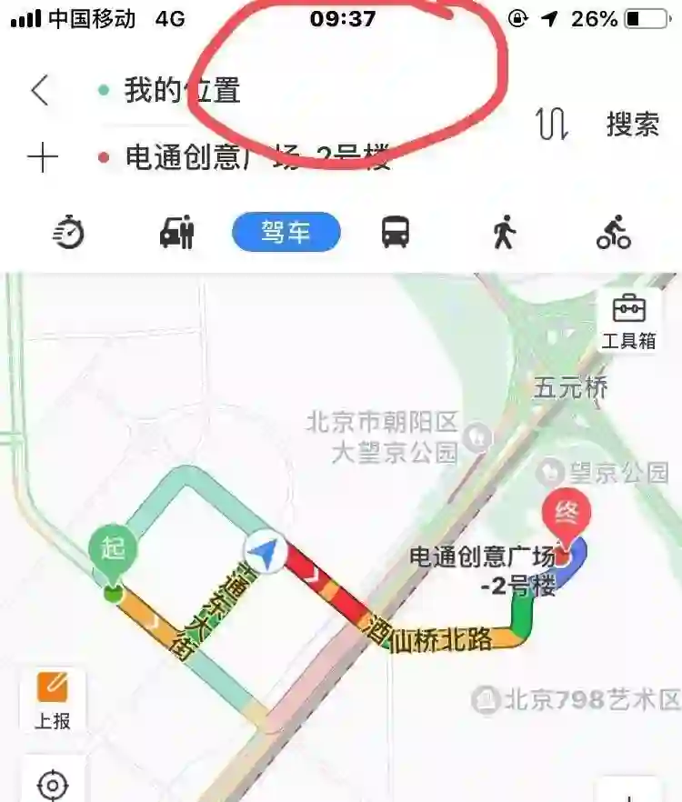 早上9:37(此时已算是弱高峰了哦),老创乘车到达望京阜通东大街与望京街交叉口,此时,距离通过大山子路口仅有777米的距离。
