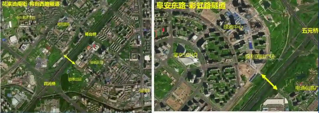 阜安东路-彩虹路隧道,连接了望京地区的望京SOHO、绿地中心、保利国际广场等商务办公区和酒仙桥地区的电子城产业园、798艺术区。