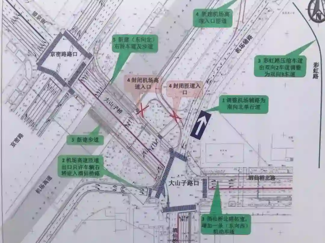 同时,对彩虹路、酒仙桥北路进行拓宽改造;将大山子路口机场高速(出京方向)的进口匝道向北调整;利用大山子桥下北侧的桥下空间,新建1条东向北右转机动车道,南侧拓宽新建人行步道。
