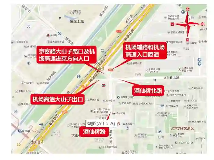 改造后,大山子路口五股车流变成三股。路口以北的机场辅路由北向南单向行驶,调整为南向北单行,从酒仙桥路、酒仙桥北路和望京街三个方向的车流,都可以驶入机场辅路。