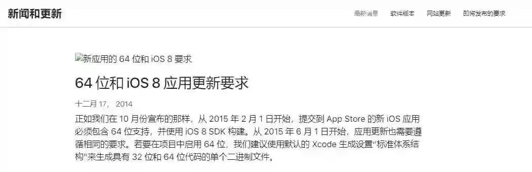 2015 年 2 月 1 日开始,苹果 iOS 就要求新上架的应用必须支持 64 位。对于原先已经上架的应用,苹果给出的截止日期是 6 月 1 日,多给了 4 个月时间迁移。