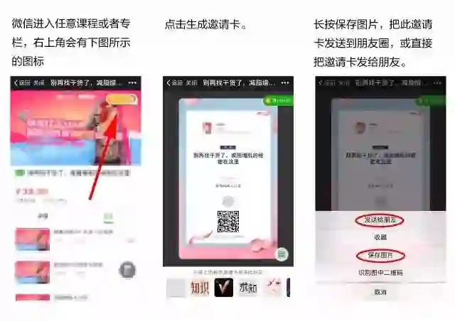 微信进入任意课程或者专栏,按照如下方式把邀请卡发到朋友圈,如果有人通过邀请卡购买,你将会获得50%的学费哦~学习还能赚钱?这么好的事儿还不快试试~