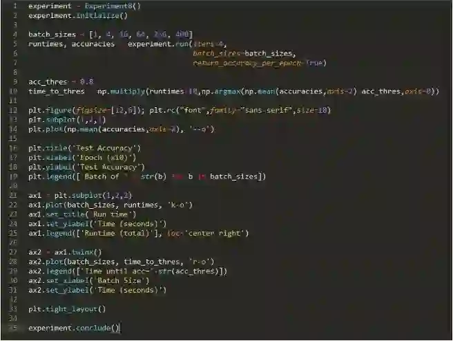 结论:正如我们预期那样,运行时间确实随着批大小的增加而下降。然而,这导致了测试正确率的妥协,因为测试正确率随着批大小的增加而单调递减。