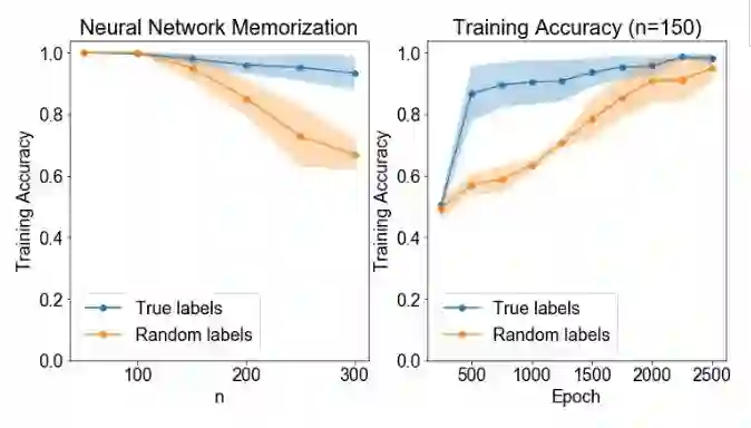 结论: 神经网络的记忆能力约为 150 个训练点。但即便如此,神经网络也需要更长的时间来学习随机标签,而不是真实值(ground truth)标签。