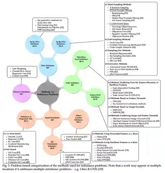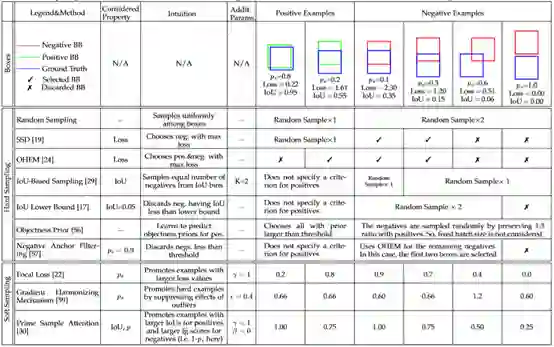 我们可以将背景类不平衡的解决方案分为四类:(i)硬采样方法,(ii)软采样方法,(iii)无采样方法和(iv)生成方法,详细方法汇总如下图所示: