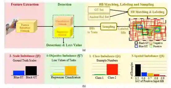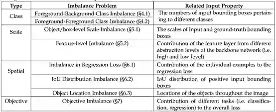当与不同类别相关的示例数量之间存在显著的不平等时,就会出现类别不平衡。虽然这方面的经典例子是前景到背景的不平衡,但前景(正)类之间也存在不平衡。当对象具有不同的比例和属于不同比例的不同数量的示例时,就会出现比例不平衡。空间不平衡是指与bounding box的空间特性有关的一组因素,比如回归惩罚、定位和IoU相关。最后,当存在最小化多个损失函数时,会出现客观不平衡(各个损失函数的权重不均衡),这在OD中通常是如此(例如分类和回归损失)。