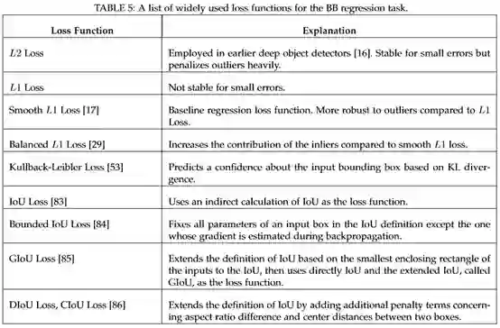 目标检测的回归损失主要有两类:第一类是基于Lp-norm-based(例如L1,L2)的损失函数,第二个是基于IoU的损失函数。上表显示了广泛使用的回归损失函数的比较。(不断解决了各类损失函数优化问题)