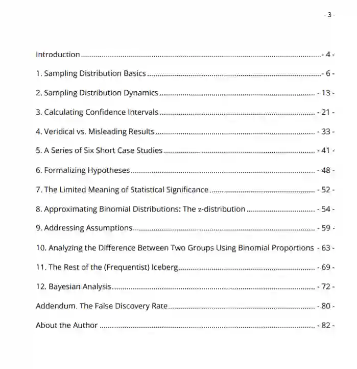 许多人觉得统计分析令人费解。为什么? 因为它需要新的思维方式。你又如何理解这些新的思维方式呢? 为了正确理解统计分析,你需要理解它的一些关键基础。阅读教科书是行不通的,因为教科书没有关注基础,而且它们涵盖了太多的内容和细节,读者必然会只见树木不见森林。我有很多方法来补救这种状况。我做的第一件事是关注一个每个人都应该熟悉的应用领域。第二,我关注最直接的调研问题和回答——你同意还是不同意?你赞成还是不赞成?我所做的第三件事是关注那些对于理解统计分析的本质和对结果的解释至关重要的基础,无论是民意调研结果还是药物试验结果。第四,我用了很多插图。即使你以前学过统计学课程,即使你知道执行统计分析的机制,你也会从这些基础中受益。